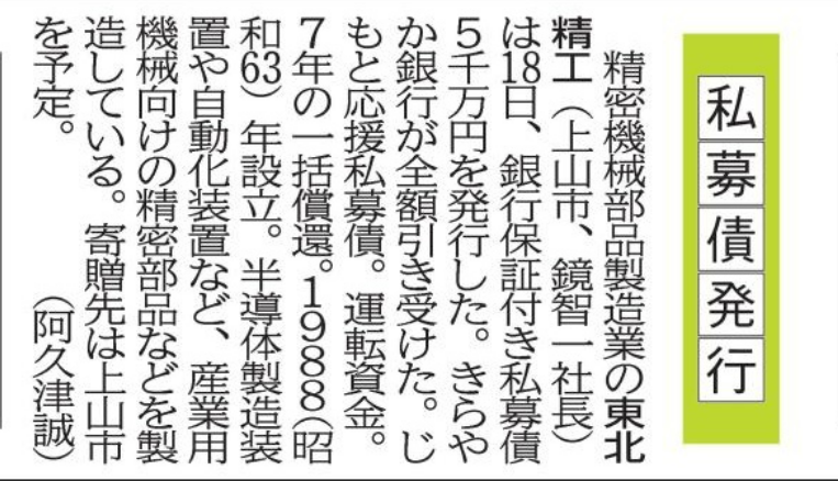 7月18日きらやか銀行様より全額引き受けていただき私募債発行いたしました。